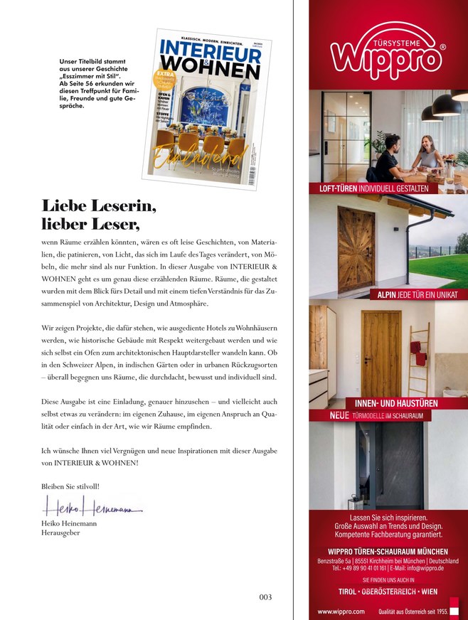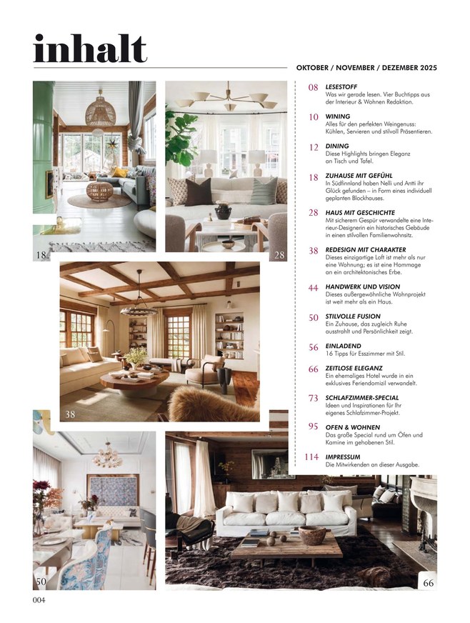 INTERIEUR WOHNEN ist ein Magazin für den klassischen Lifestyle und richtet sich an all diejenigen, die Wert auf eine dauerhaft stilvolle und hochwertige Einrichtung legen. Deshalb zeigt INTERIEUR WOHNEN in noch nie da gewesener Form Wohnreportagen und interessante Artikel, etwa über Qualität und echte Wohnwerte.