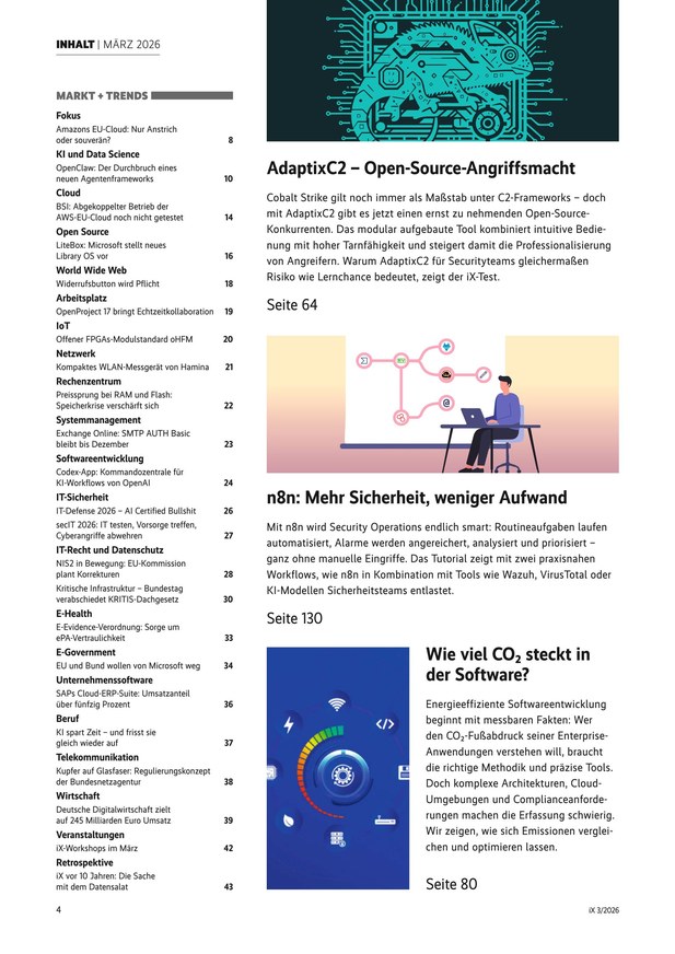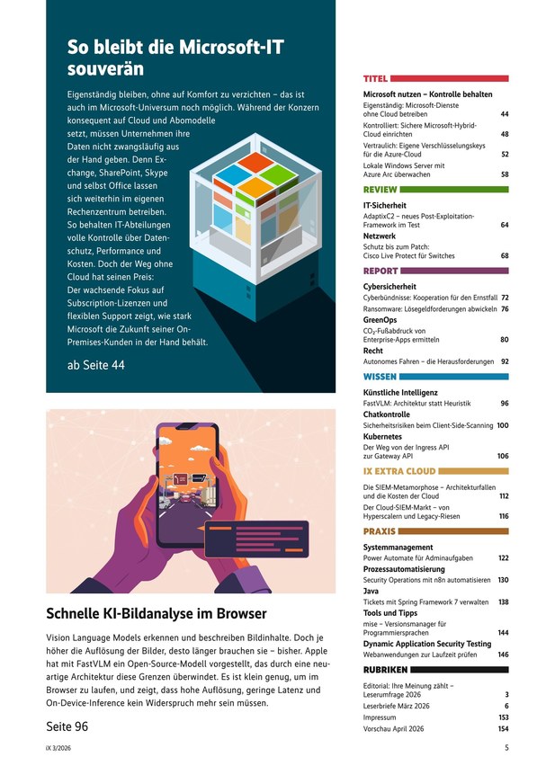 Das Magazin iX steht für die Vermittlung von Fachwissen für den IT-Profi. Die Computerzeitschrift richtet sich an Menschen, die bereits über umfangreiches Wissen verfügen und sich intensiver mit einzelnen Teilbereichen der IT beschäftigen möchten. Lassen Sie sich mit dem ePaper über neue Hard- und Software-Produkte informieren und profitieren Sie von Experten-Tipps, die Ihnen den Umgang mit Ihrem Computer bzw. Netzwerk erleichtern. Alle Inhalte der gedruckten Ausgabe finden Sie in identischer Aufmachung im ePaper und können dieses unkompliziert und komfortabel auf Smartphone, Tablet oder Computer lesen.