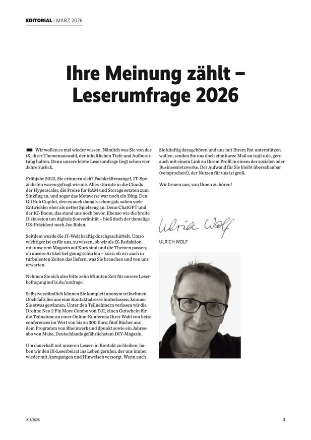 Lesen Sie iX als ePaper im iKiosk! Neben der jeweils neusten Ausgabe des digitalen Informatik-Fachmagazins steht Ihnen das Zugriff auf das Archiv zur Verfügung: Blättern Sie in vergangenen Ausgaben des ePapers und informieren Sie sich über interessante Themen Ihres Fachbereichs.