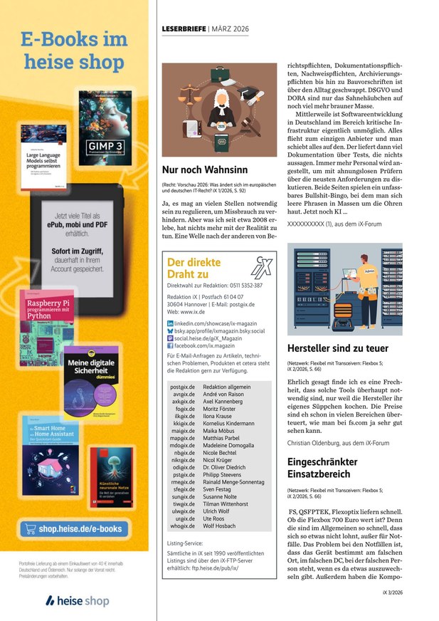 Auf rund 160 Seiten berichtet die Redaktion jeden Monat in den Ressorts Markt + Trends, Review, Report, Wissen, Praxis und Medien. 13 festangestellte Fachredakteure sorgen dafür, dass die Inhalte qualitativ Ihren Ansprüchen als IT-Profi zu 100% entsprechen. Herausgegeben wird iX von der Heise Medien GmbH & Co. KG.