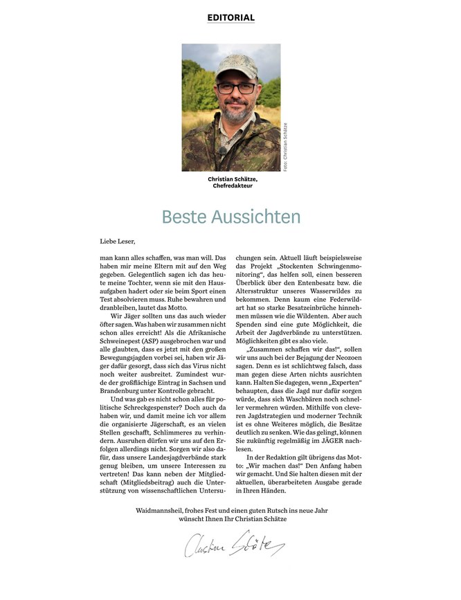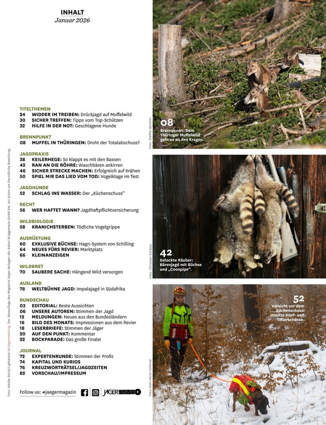 • Jäger-Themen - neben dem großen Titelthema jeder Ausgabe deckt die Zeitschrift auch zahlreiche weitere Themen ab, die aktuell interessant sind oder sich beispielsweise saisonal anbieten.