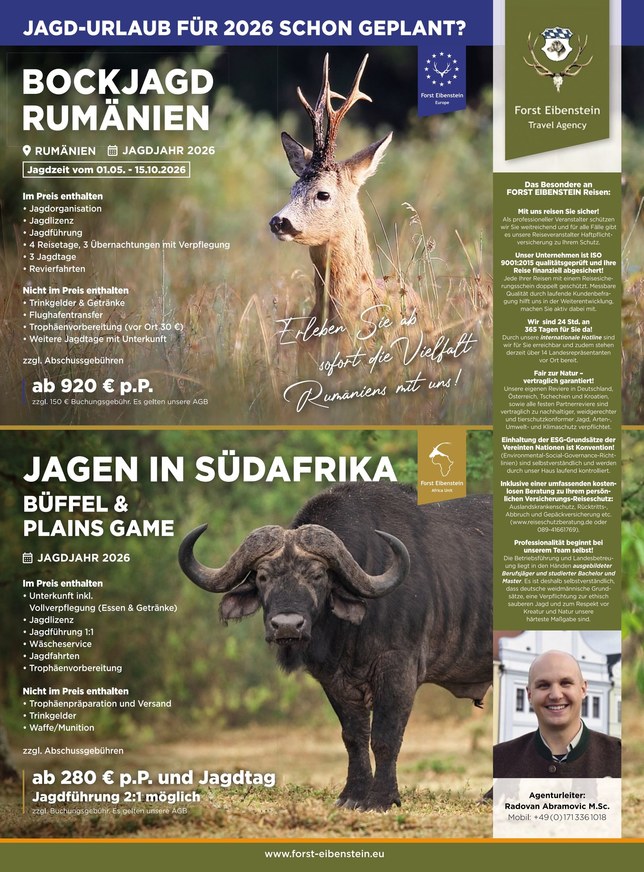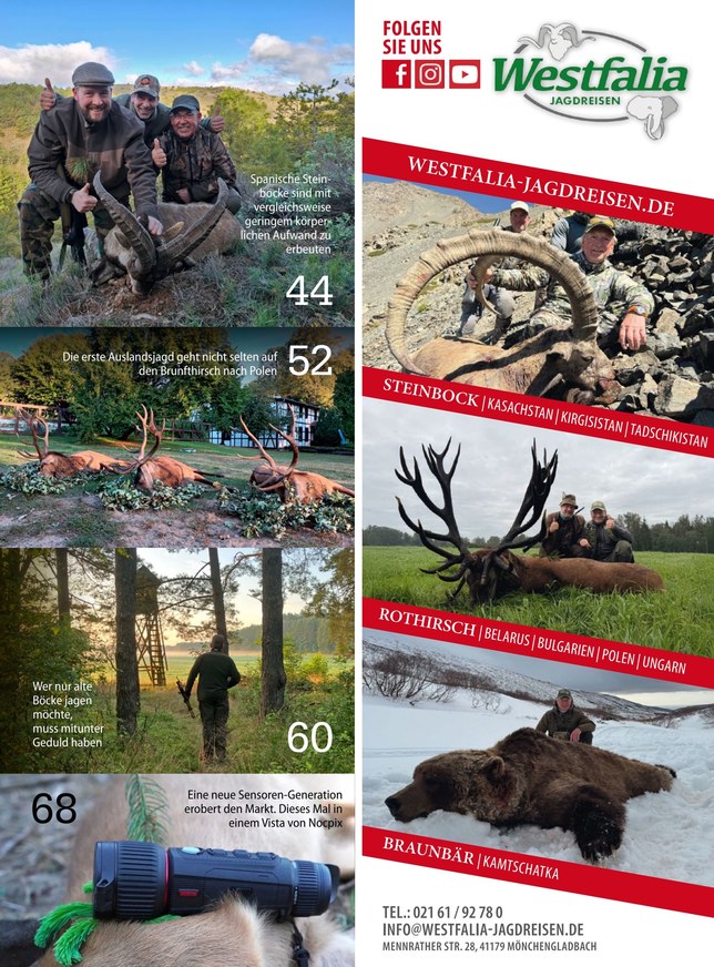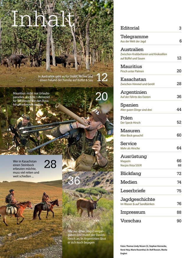 JAGEN WELTWEIT ist das einzige Magazin in Europa, das sich ausschließlich mit den Themen Jagdreisen und Auslandsjagd beschäftigt. Das ePaper bietet Reisereportagen, Produkttests und Planungshilfen. Weiterlesen...