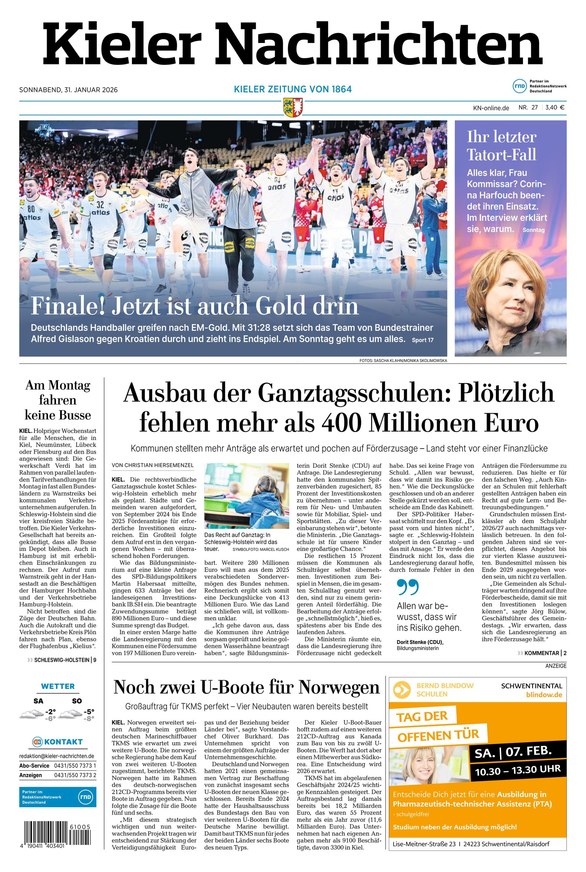 Die Kieler Nachrichten berichten über alles, was in Kiel und Schleswig-Holstein wichtig ist. Das ePaper der Tageszeitung versorgt Sie täglich mit den wichtigsten News und Infos aus der Region. Weiterlesen...