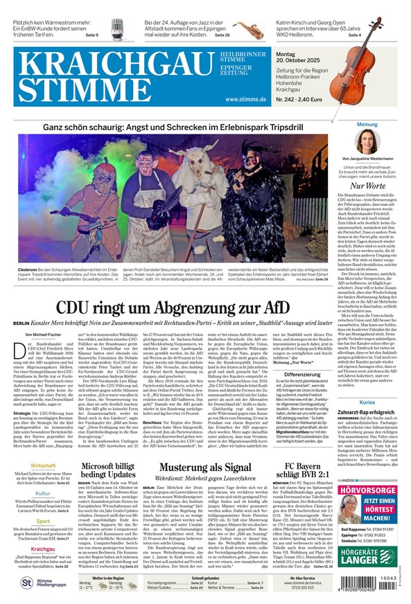 Das E-Paper ist die digitale Ausgabe Ihrer Kraichgau Stimme und versorgt Sie von Montag bis Samstag zuverlässig mit Nachrichten, Neuigkeiten, Hintergrundgeschichten und Reportagen der Regionen Heilbronn, Hohenlohe und Kraichgau sowie der Welt. Neben den Ressorts Wirtschaft, Kultur, Sport und Region erhalten Sie außerdem fundiert recherchierte Service-Themen und übersichtliche Terminankündigungen.