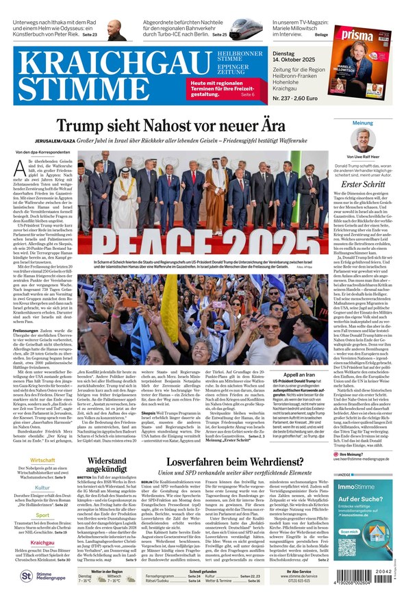 Das E-Paper ist die digitale Ausgabe Ihrer Kraichgau Stimme und versorgt Sie von Montag bis Samstag zuverlässig mit Nachrichten, Neuigkeiten, Hintergrundgeschichten und Reportagen der Regionen Heilbronn, Hohenlohe und Kraichgau sowie der Welt. Neben den Ressorts Wirtschaft, Kultur, Sport und Region erhalten Sie außerdem fundiert recherchierte Service-Themen und übersichtliche Terminankündigungen.