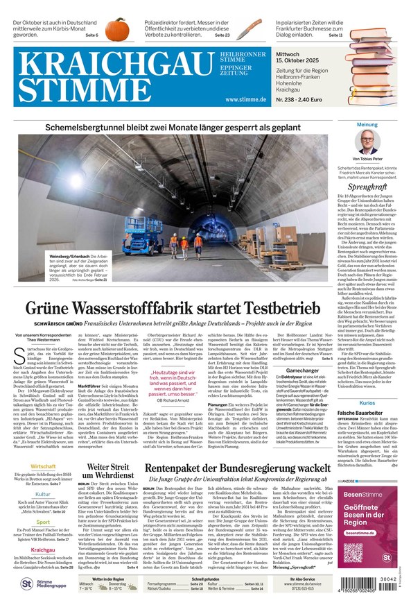 Das E-Paper ist die digitale Ausgabe Ihrer Kraichgau Stimme und versorgt Sie von Montag bis Samstag zuverlässig mit Nachrichten, Neuigkeiten, Hintergrundgeschichten und Reportagen der Regionen Heilbronn, Hohenlohe und Kraichgau sowie der Welt. Neben den Ressorts Wirtschaft, Kultur, Sport und Region erhalten Sie außerdem fundiert recherchierte Service-Themen und übersichtliche Terminankündigungen.