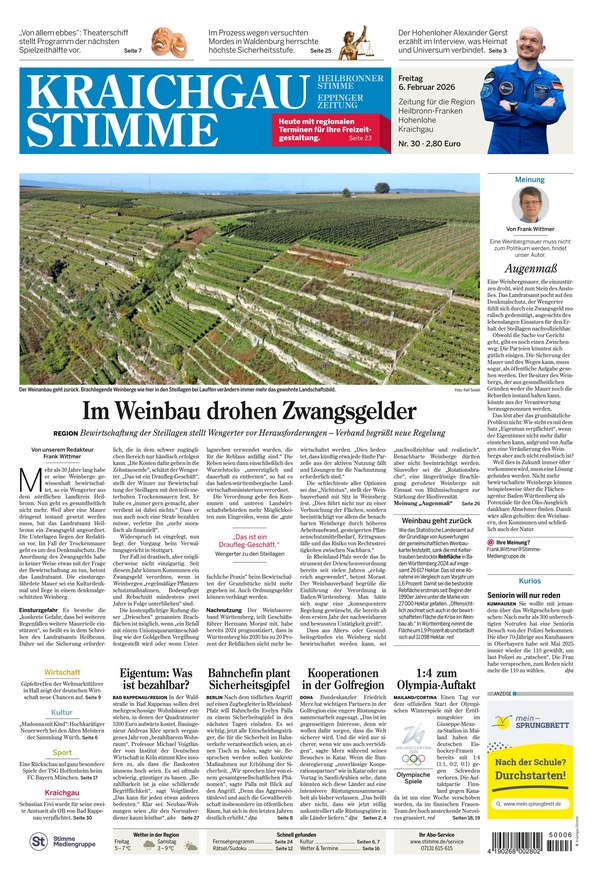 Das E-Paper ist die digitale Ausgabe Ihrer Kraichgau Stimme und versorgt Sie von Montag bis Samstag zuverlässig mit Nachrichten, Neuigkeiten, Hintergrundgeschichten und Reportagen der Regionen Heilbronn, Hohenlohe und Kraichgau sowie der Welt. Neben den Ressorts Wirtschaft, Kultur, Sport und Region erhalten Sie außerdem fundiert recherchierte Service-Themen und übersichtliche Terminankündigungen.