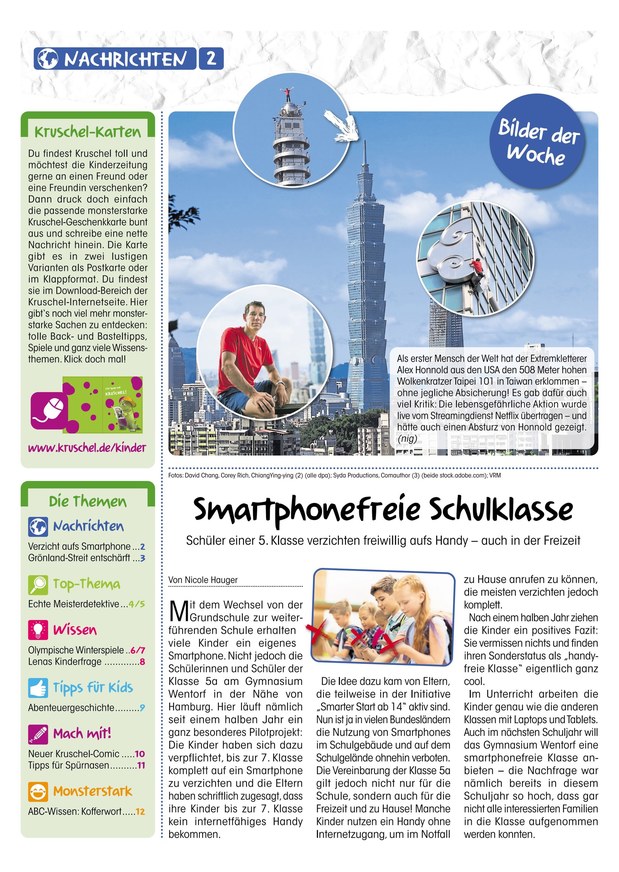Die Kinderzeitung „Kruschel“ erklärt Kindern jeden Samstag auf 12 Seiten die Welt. Nachrichten und Wissenswertes über Tiere, Sport, Wissenschaft und Technik – aktuell, für Kinder verständlich aufbereitet und spannend erzählt.