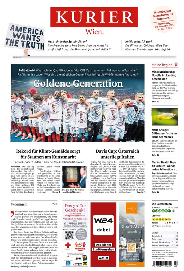 Die österreichische Tageszeitung Kurier berichtet über alle wichtigen Nachrichten aus Wien, Österreich und der Welt. Bleiben Sie mit dem ePaper über alle relevanten Themen informiert. Weiterlesen...