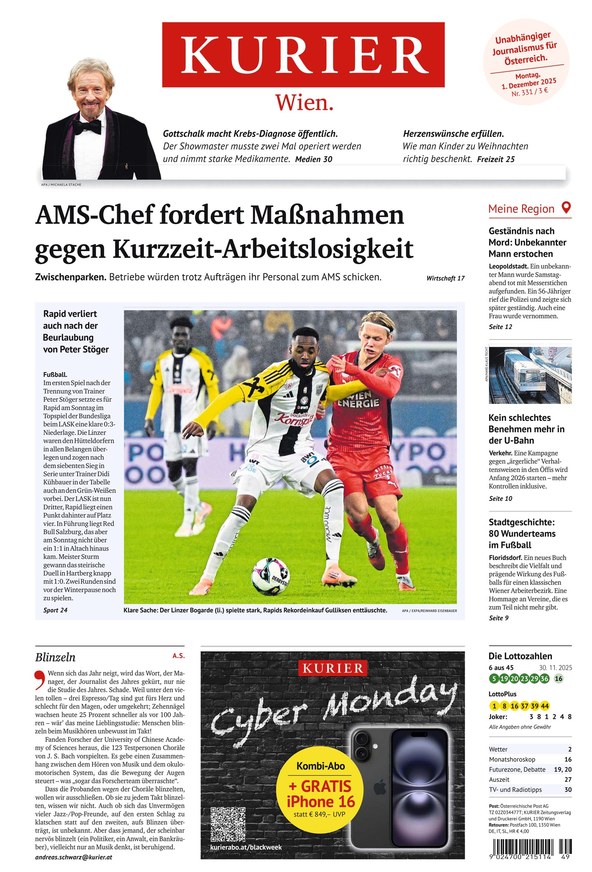Die österreichische Tageszeitung Kurier berichtet über alle wichtigen Nachrichten aus Wien, Österreich und der Welt. Bleiben Sie mit dem ePaper über alle relevanten Themen informiert. Weiterlesen...