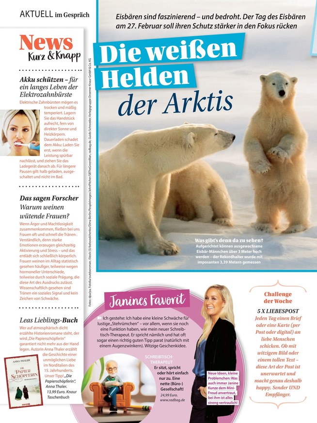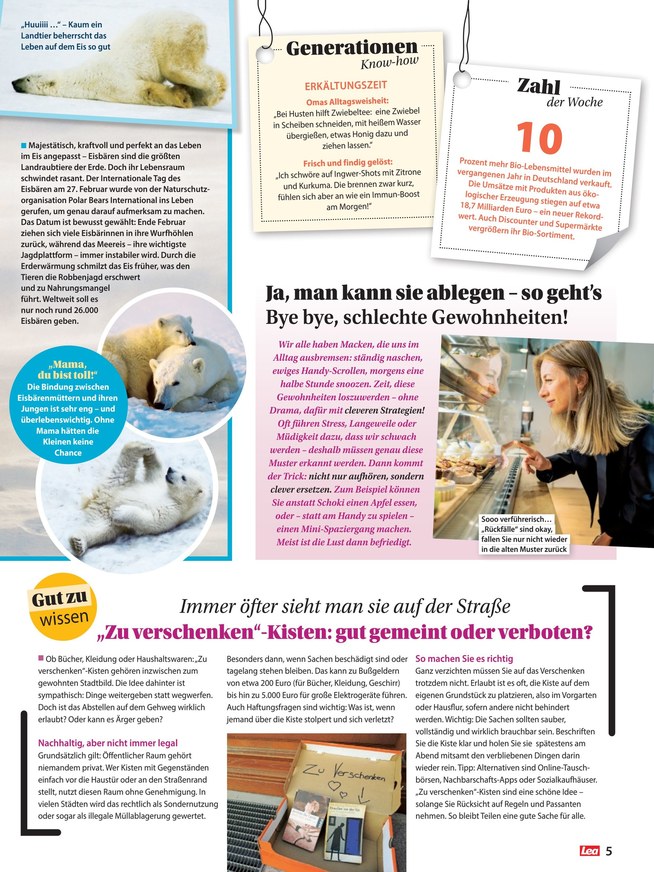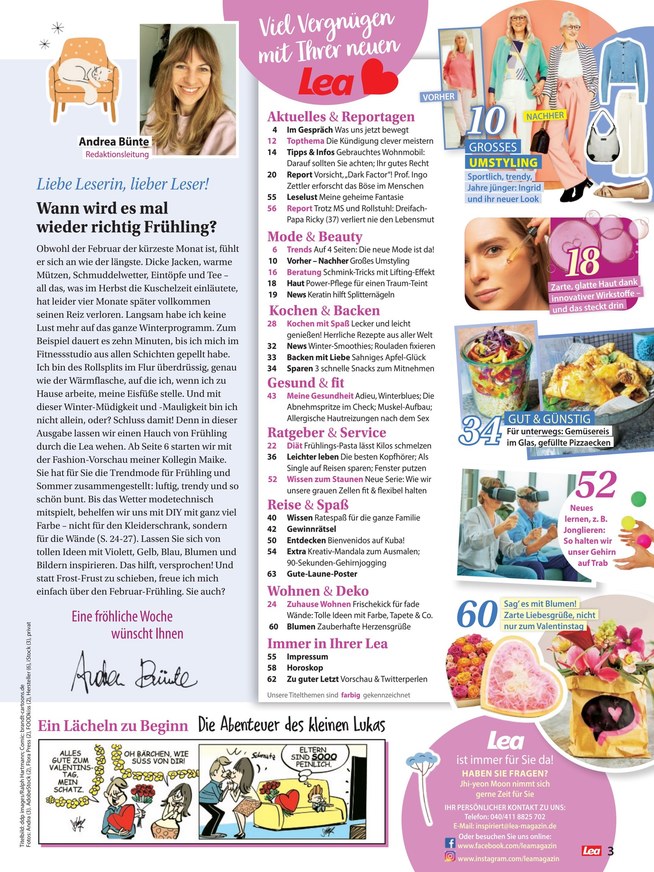 Seit 20 Jahren ist Lea für Leserinnen eine abwechslungsreiche Informationsquelle für verschiedene Lebensbereiche. Die Zeitschrift erscheint wöchentlich im Klambt-Verlag und ist hier im iKiosk stets aktuell verfügbar. Weiterlesen...
