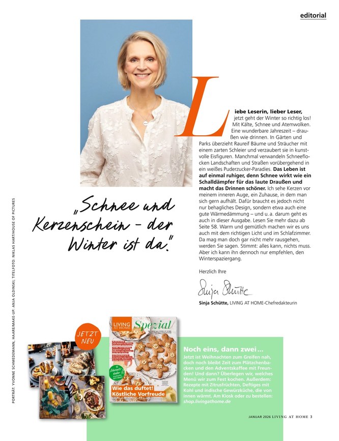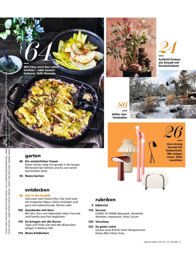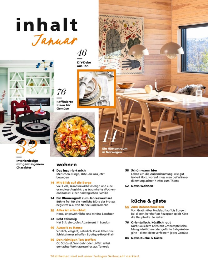 Bei einem schönen Zuhause geht es um deutlich mehr als nur Wohnen und Einrichtung. Das hat die Redaktion von LIVING AT HOME schon lange erkannt und verinnerlicht. Wie Sie die eigenen vier Wände so gestalten und Ihr Leben so führen, dass Sie sich möglichst wohl fühlen, erfahren Sie Monat für Monat in diesem Magazin. Sie sind empfänglich für die Schönheit von Einrichtungsgegenständen, Wohnaccessoires und Dekorationsobjekten? Dann werden Sie in LIVING AT HOME Inspiration finden, die wie maßgeschneidert Ihren Geschmack trifft. Aufgebaut ist das Magazin wie ein moderner und stylischer Concept Store, der mit hochwertigen Stilwelten genau den Zeitgeist trifft. In folgende vier Rubriken ist jede Ausgabe unterteilt: