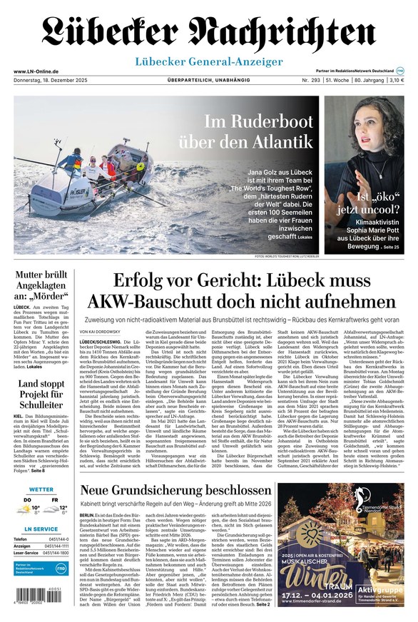 Die regionale Tageszeitung der Lübecker Nachrichten berichtet über aktuelle Neuigkeiten und Geschehnisse aus dem südöstlichen Schleswig-Holstein und dem westlichen Mecklenburg-Vorpommern. Weiterlesen...