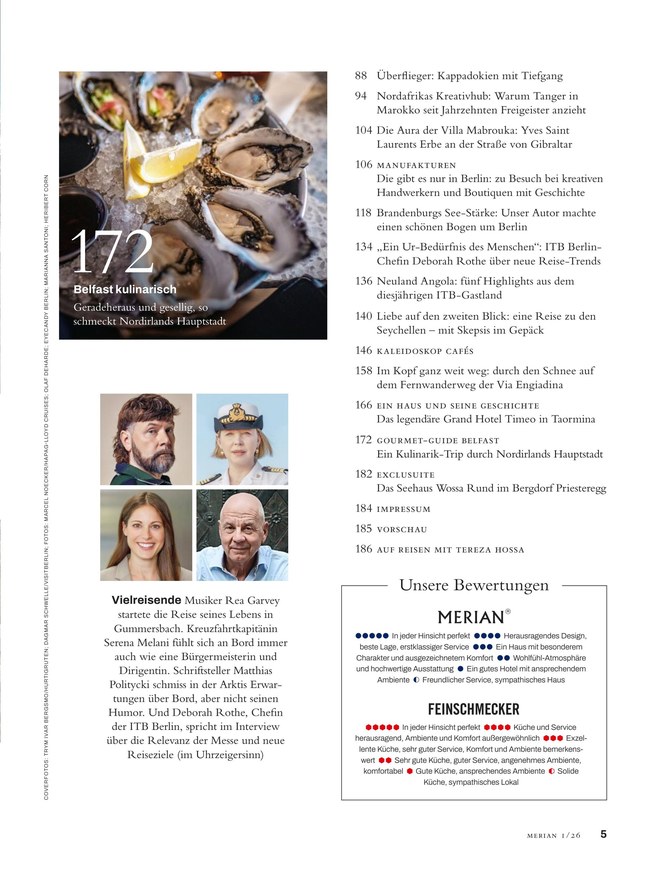 Mit Artikeln, Reportagen, Essays und Fotostrecken porträtiert das Reisemagazin Merian Städte, Regionen oder Länder. Jede Ausgabe des ePapers widmet sich ausführlich einem Reiseziel. Weiterlesen...
