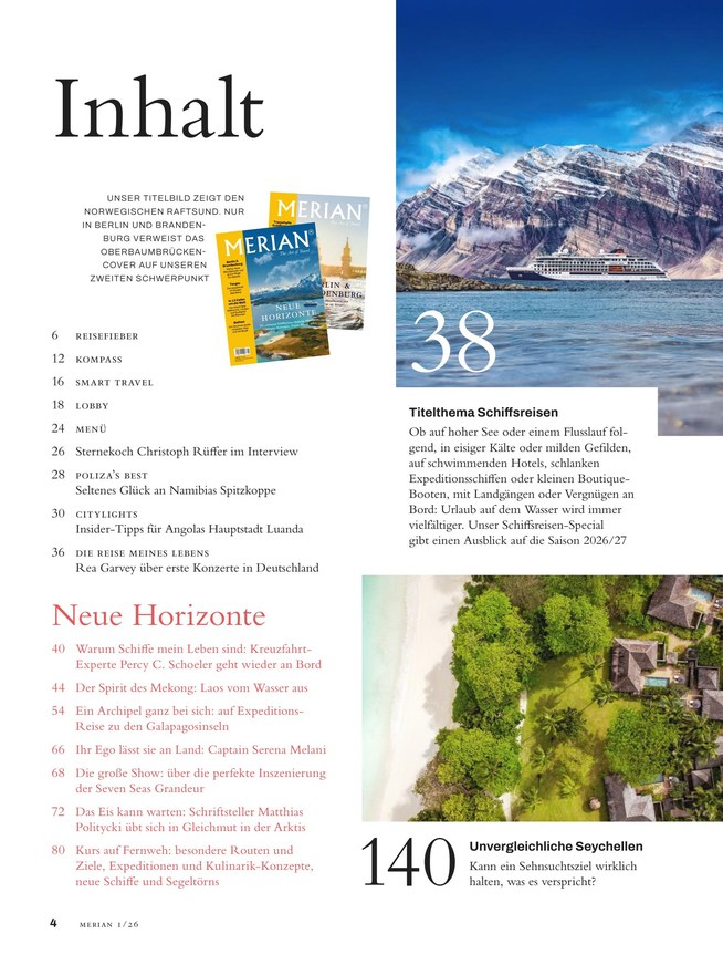 Sie wollen reisen statt verreisen und träumen von Reisen statt von Urlaub? Dann ist Merian Ihr passender Begleiter. Das Magazin steht seit mehr als sechs Jahrzehnten für kompetente und spannende Informationen rund um das Thema Reisen. Jede Ausgabe widmet sich einer bestimmten Stadt, Region oder einem Land und liefert ein umfangreiches Porträt, praktische Tipps, sowie spannende Infos. Merian erscheint 6 mal im Jahr - auch als ePaper.