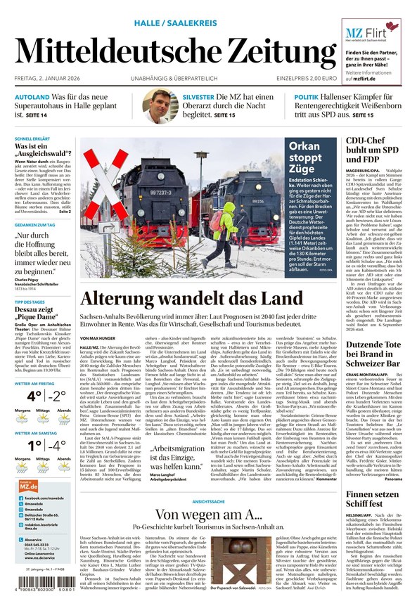 Als regionale Tageszeitung konzentriert sich die Mitteldeutsche Zeitung vor allem auf das Gebiet im südlichen Sachsen-Anhalt. Tagesaktuelle News aus Deutschland und der Welt ergänzen die regionale Berichterstattung. Neben Wirtschaftsnachrichten bildet die Mitteldeutsche Zeitung alle wichtigen politischen Entscheidungen ab. Ein kompetent recherchierter Ratgeberteil rundet das ePaper der Mitteldeutschen Zeitung ab - Leser profitieren von fundierten Tipps rund um die Themen Gesundheit, Verbraucherschutz und Finanzen.