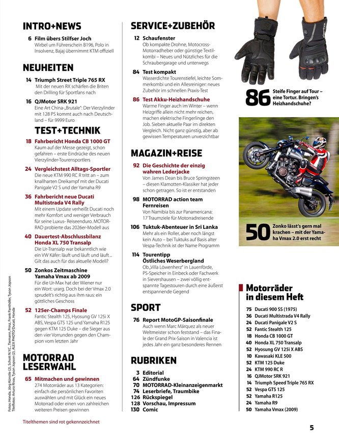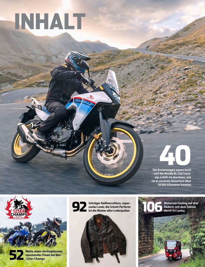 Kritische Analysen der neuesten Bikes, geheime Pläne der wichtigsten Motorrad-Hersteller, neueste Trends im Zweirad-Segment und dazu noch kompetente Motorsport-Berichterstattung - MOTORRAD besticht durch ein thematisches Spektrum, das in seiner journalistischen Qualität einzigartig ist. Zudem werden im ePaper Motorräder und Zubehör in regelmäßigen Tests bis ins kleinste Detail hinein beleuchtet und bewertet. Service-Tipps und inspirierende Reiseberichte ergänzen die redaktionelle Vielfalt jeder Ausgabe. Einmal im Jahr ermittelt die Zeitschrift MOTORRAD zudem mit Hilfe ihrer Leser das "Motorrad des Jahres", und erstellt so ein exklusives und internationales Meinungsbarometer auf Verbraucherbasis.