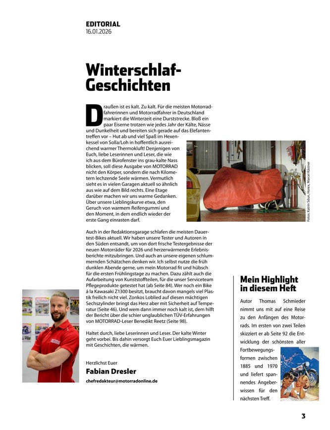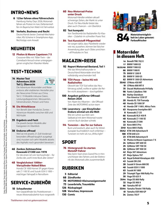 Kritische Analysen der neuesten Bikes, geheime Pläne der wichtigsten Motorrad-Hersteller, neueste Trends im Zweirad-Segment und dazu noch kompetente Motorsport-Berichterstattung - MOTORRAD besticht durch ein thematisches Spektrum, das in seiner journalistischen Qualität einzigartig ist. Zudem werden im ePaper Motorräder und Zubehör in regelmäßigen Tests bis ins kleinste Detail hinein beleuchtet und bewertet. Service-Tipps und inspirierende Reiseberichte ergänzen die redaktionelle Vielfalt jeder Ausgabe. Einmal im Jahr ermittelt die Zeitschrift MOTORRAD zudem mit Hilfe ihrer Leser das "Motorrad des Jahres", und erstellt so ein exklusives und internationales Meinungsbarometer auf Verbraucherbasis.