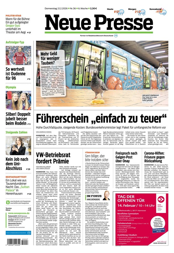 Die Neue Presse ist eine Tageszeitung für den Raum Hannover und Umgebung, die zwischen bürgerlicher und Boulevard-Zeitung angesiedelt ist. Weiterlesen...
