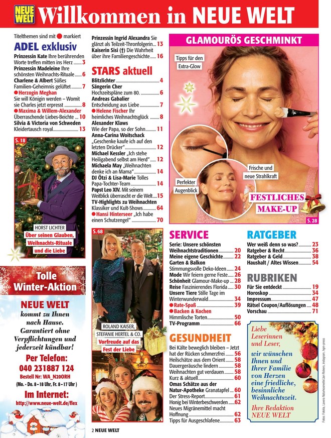 Die Zeitschrift erscheint bei FUNKE Entertain und ist als Einzelausgabe und im Abonnement hier im iKiosk erhältlich. Seit mehr als 75 Jahren bietet die Zeitschrift Neue Welt jede Woche kompetente Tipps zu Gesundheit, Ernährung und Glück. Außerdem gibt es aktuelle Neuigkeiten zu allen Stars und in jedem Heft einen extra großen Rätselbereich.