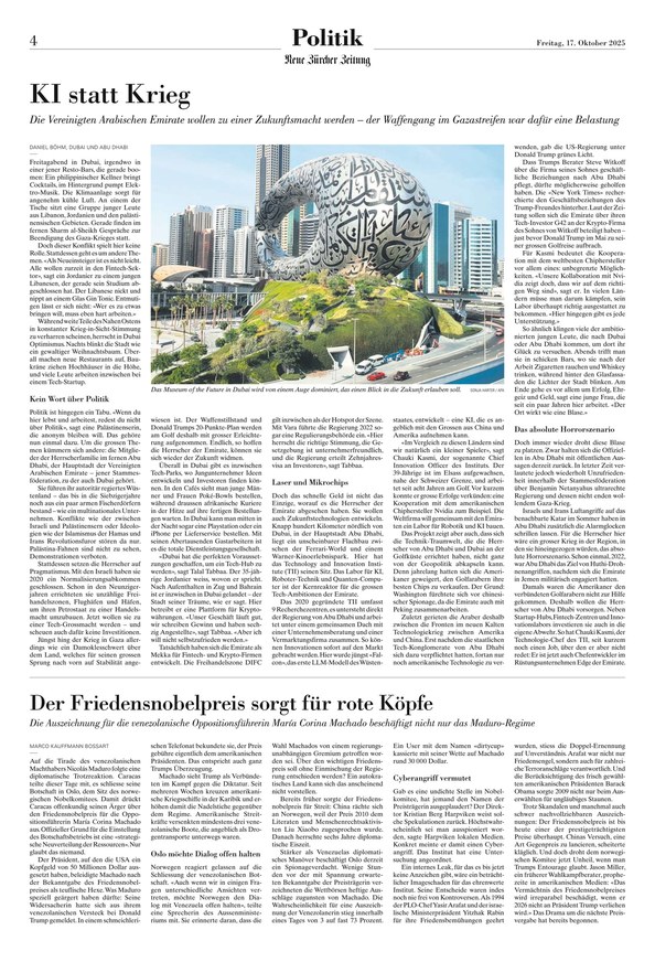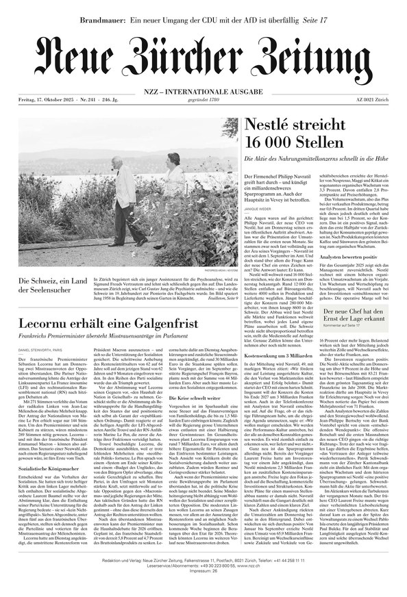 Die Neue Zürcher Zeitung International steht seit 1780 für eine fundierte, präzise und ausführliche Berichterstattung über das internationale, nationale und regionale Geschehen. Weiterlesen...