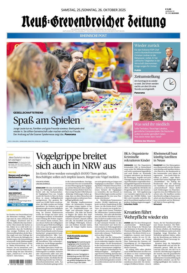 Als Tageszeitung für den Rhein-Kreis Neuss berichtet die Neuss-Grevenbroicher Zeitung über alle wichtigen Nachrichten der Region. Das ePaper bietet Ihnen maximalen Genuss beim Zeitungslesen und viele Vorteile! Weiterlesen...