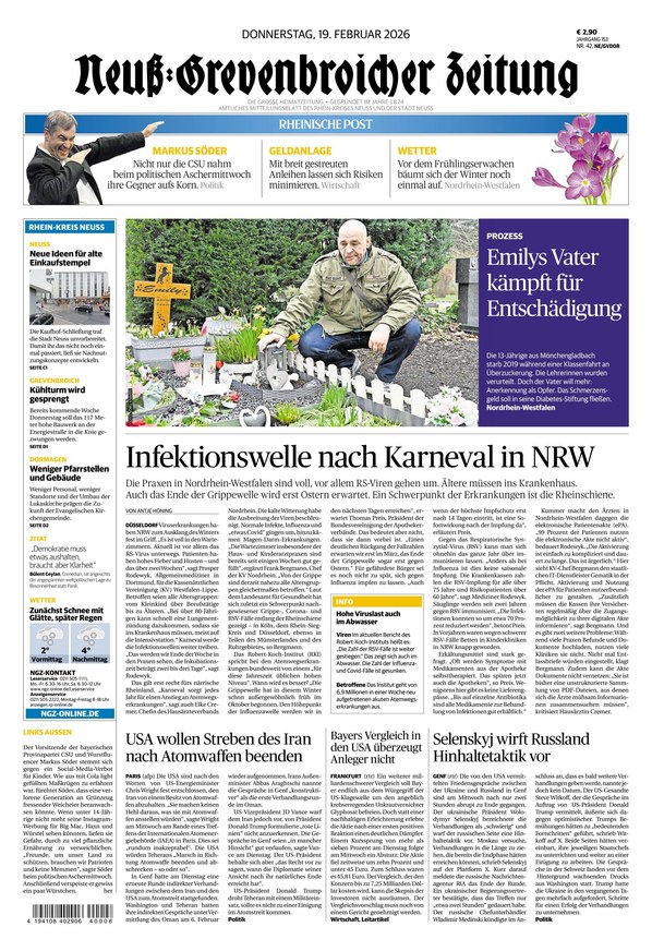 Die Neuss-Grevenbroicher Zeitung (NGZ) versorgt Sie von Montag bis Samstag mit aktuellen Regionalnachrichten aus Nordrhein-Westfalen und News aus aller Welt: Bleiben Sie mit dem ePaper Ihrer Tageszeitung über alle relevanten Themen in den Bereichen Politik, Wirtschaft, Kultur und Sport informiert. Lesen Sie das NGZ-ePaper am Smartphone, Tablet oder Computer - wann Sie wollen und wo Sie wollen.