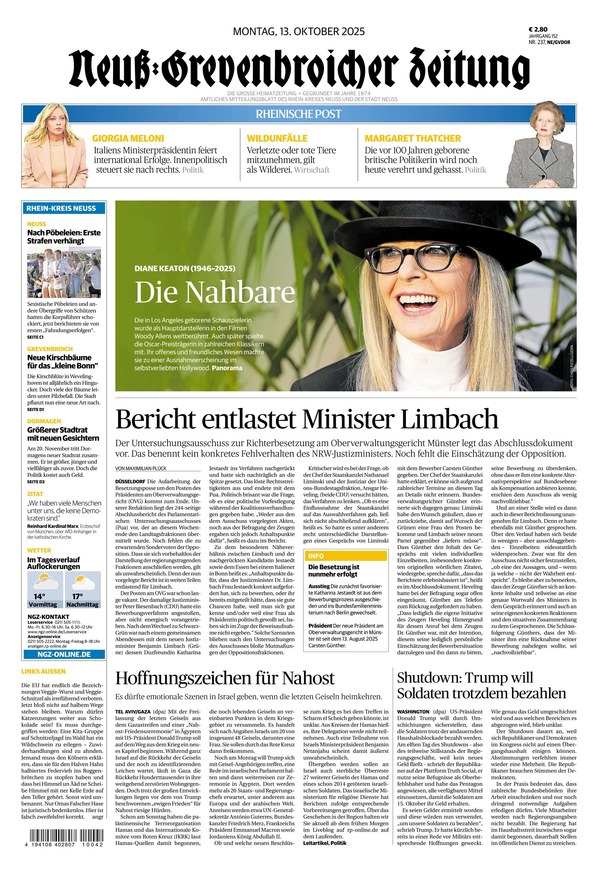 Als Tageszeitung für den Rhein-Kreis Neuss berichtet die Neuss-Grevenbroicher Zeitung über alle wichtigen Nachrichten der Region. Das ePaper bietet Ihnen maximalen Genuss beim Zeitungslesen und viele Vorteile! Weiterlesen...