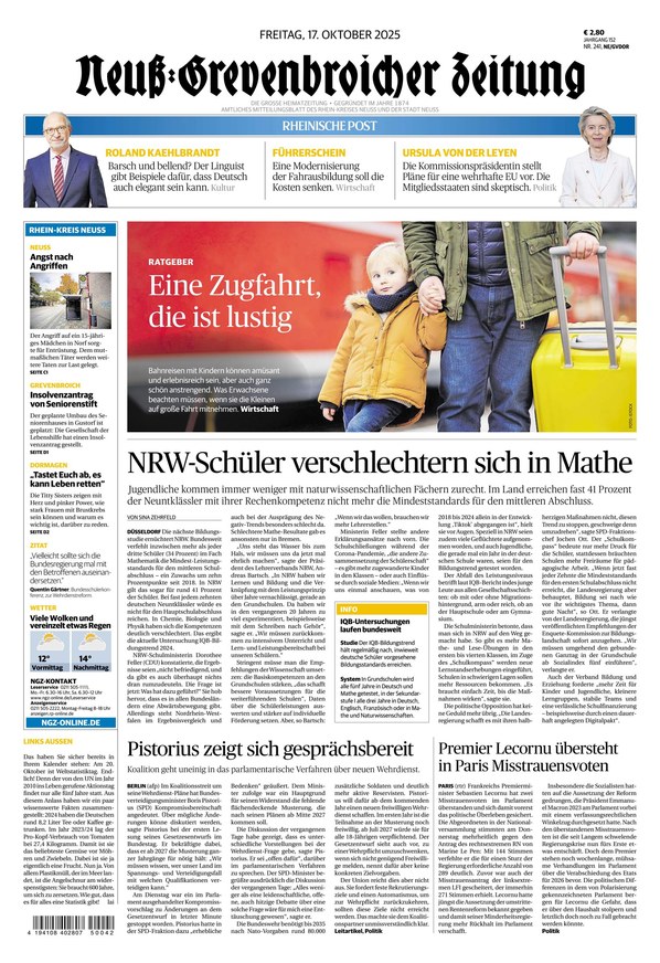 Als Tageszeitung für den Rhein-Kreis Neuss berichtet die Neuss-Grevenbroicher Zeitung über alle wichtigen Nachrichten der Region. Das ePaper bietet Ihnen maximalen Genuss beim Zeitungslesen und viele Vorteile! Weiterlesen...