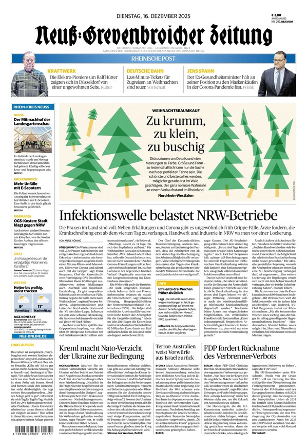 Als Tageszeitung für den Rhein-Kreis Neuss berichtet die Neuss-Grevenbroicher Zeitung über alle wichtigen Nachrichten der Region. Das ePaper bietet Ihnen maximalen Genuss beim Zeitungslesen und viele Vorteile! Weiterlesen...