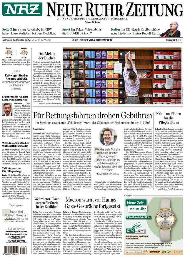 Die Neue Ruhr Zeitung (NRZ) ist Ihre Tageszeitung für Essen und Umgebung. Der Schwerpunkt liegt auf der lokalen Berichterstattung, alle wichtigen News und Themen der Woche finden Sie im ePaper! Weiterlesen...