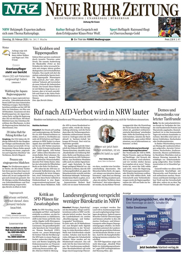 Ergänzt wird das inhaltliche Angebot durch das aktuelle Fernsehprogramm, Familienanzeigen und den Marktplatz mit Kleinanzeigen. Für Kinder gibt es eine eigene Seite, die mit dem Namen "Knuts Klartext" betitelt ist. Die erste Ausgabe der Tageszeitung, die zur Funke Mediengruppe gehört, erschien am 13. Juli 1946. Die gedruckte Ausgabe und das ePaper der NRZ sind inhaltlich und von ihrer Aufmachung her identisch - die digitale Tageszeitung liefert Ihnen die gewohnte Qualität der Print-Ausgabe.