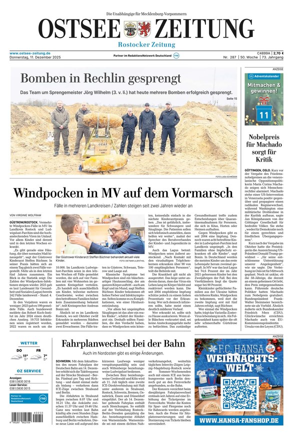 Die Ostsee-Zeitung berichtet vornehmlich als regionale Tageszeitung in Mecklenburg-Vorpommern. Sie bietet verschiedenste Ressorts wie etwa die Region Rostock oder Nachrichten aus Deutschland und aller Welt. Weiterlesen...