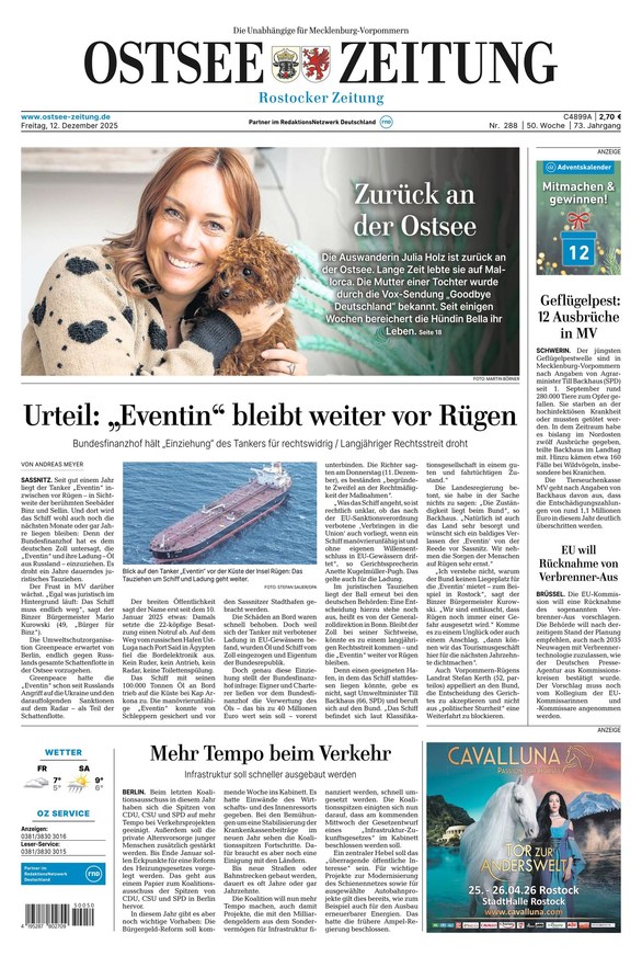 Die Ostsee-Zeitung berichtet vornehmlich als regionale Tageszeitung in Mecklenburg-Vorpommern. Sie bietet verschiedenste Ressorts wie etwa die Region Rostock oder Nachrichten aus Deutschland und aller Welt. Weiterlesen...