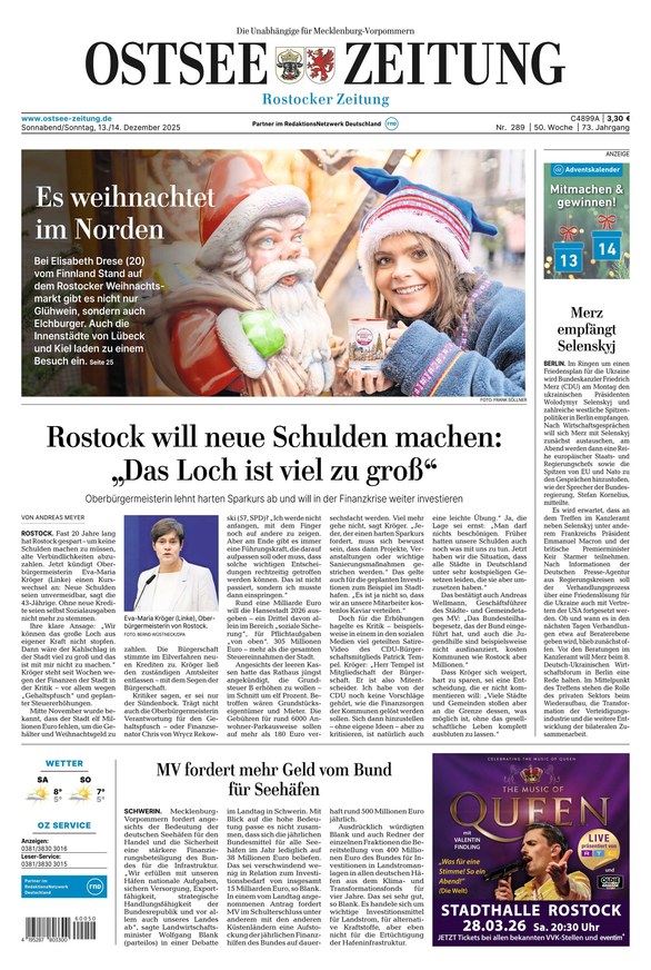Die Ostsee-Zeitung berichtet vornehmlich als regionale Tageszeitung in Mecklenburg-Vorpommern. Sie bietet verschiedenste Ressorts wie etwa die Region Rostock oder Nachrichten aus Deutschland und aller Welt. Weiterlesen...