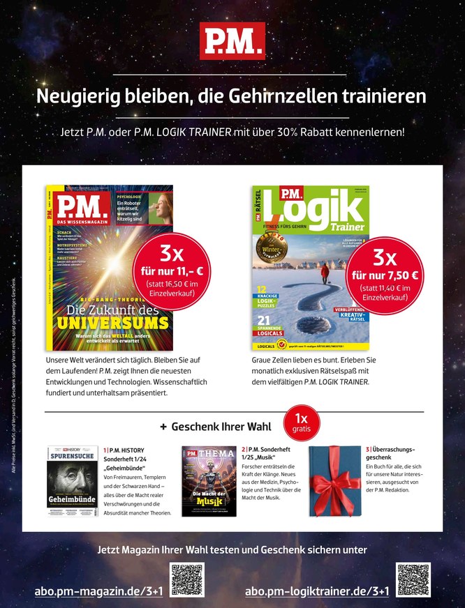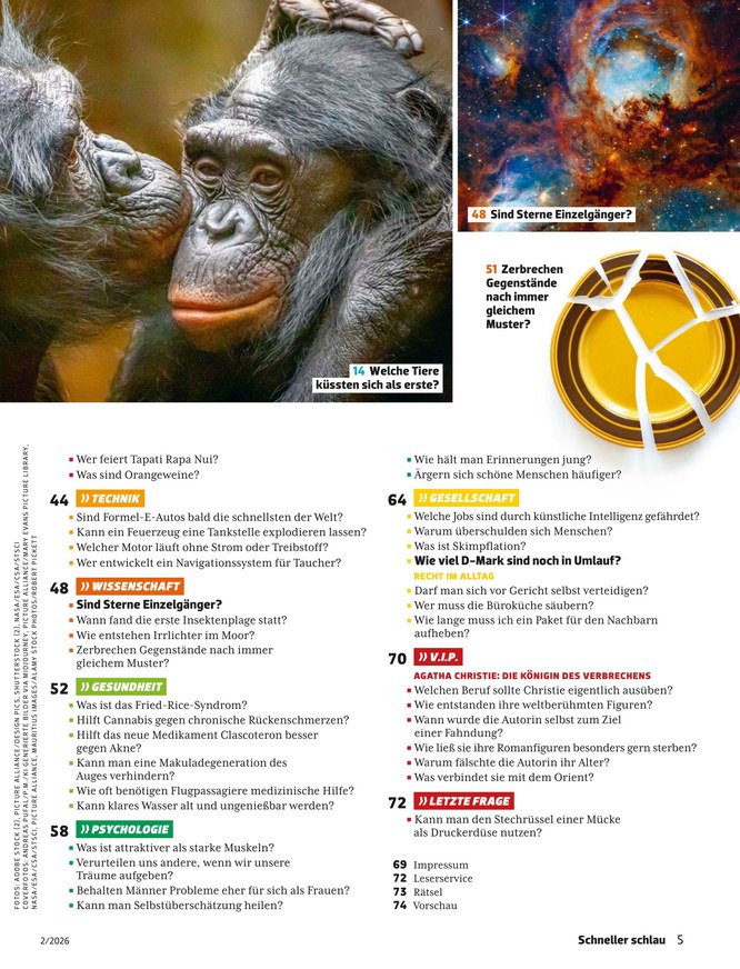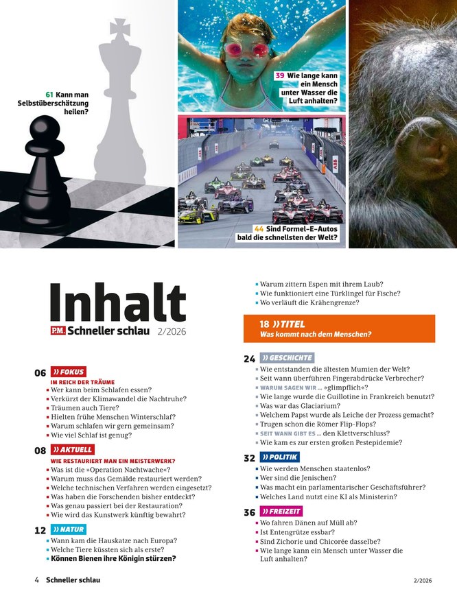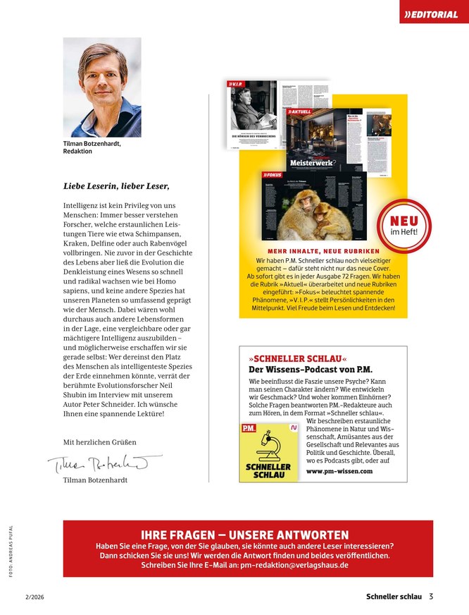 P.M. SCHNELLER SCHLAU - Fragen & Antworten ist eine Zeitschrift, die schnelles Wissen und spannende Themen repräsentiert. Der Name der Zeitschrift ist Programm: In jeder Ausgabe beschäftigt sich die Redaktion mit zahlreichen Fragen und liefert im gleichen Zug die entsprechenden Antworten. Die Lektüre ist kurzweilig und unterhaltsam. Das ePaper von P.M. SCHNELLER SCHLAU - Fragen & Antworten erscheint monatlich.