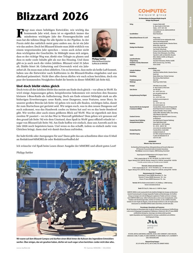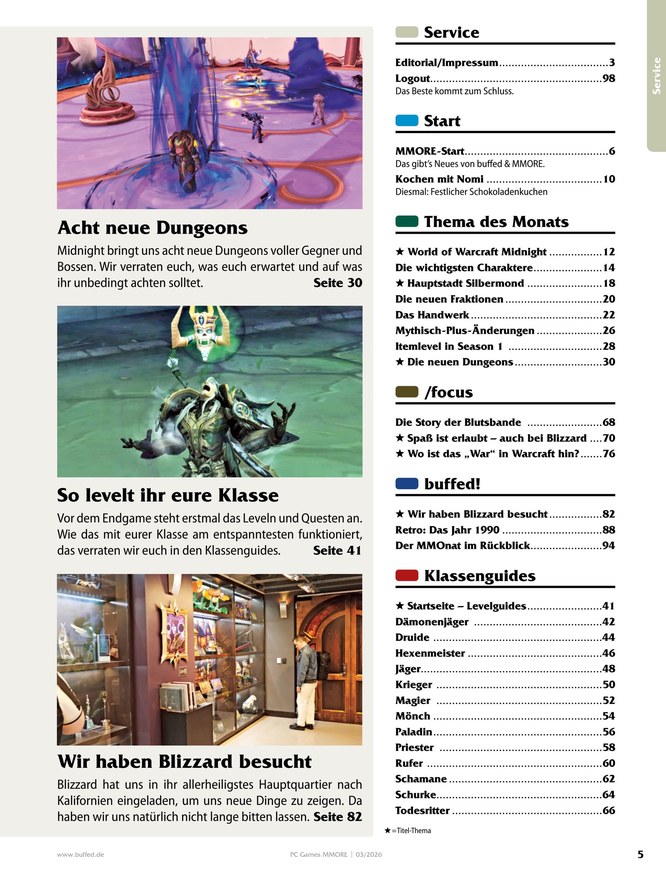 PC Games MMore ist das Kompendium für alle World of Warcraft-Enthusiasten, die sich umfassend über Instanzen, Talente, Quests und Berufe informieren wollen. Was sind die Klassen-Challenges des Magierturms? Wer sind die Bosse im Schlachtzug "Das Grabmal von Sargeras"? Jede Ausgabe von PC Games MMore ist randvoll gepackt mit spannenden Neuigkeiten, Guides und Specials zu WoW. Weitere Seiten enthalten zudem Gaming-Themen abseits von World of Warcraft. Ob Anfänger oder Profi - hier findet jeder die richtigen Tipps und Themen, um in der riesigen Spielewelt stets bestens informiert zu sein.