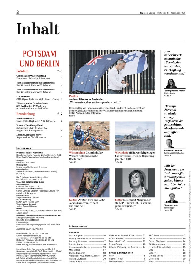 Wenn Sie täglich über die neuesten Geschehnisse informiert sein wollen, dann sind die Potsdamer Neueste Nachrichten PNN die richtige Wahl. Neben wichtigen regionalen Berichten über die Landeshauptstadt Potsdam und das Land Brandenburg wird in Kooperation mit dem Tagesspiegel auch über nationale und internationale Themen berichtet. Die Potsdamer Neueste Nachrichten greifen bei Ihren Recherchen auf ein weltweit einmaliges Expertenteam zurück. Eine fundierte Berichterstattung zu allen Bereichen (Politik, Verkehr, Bau, Gesundheit uvm.) ist der Anspruch, dem die Potsdamer Neueste Nachrichten seit 1951 gerecht werden.