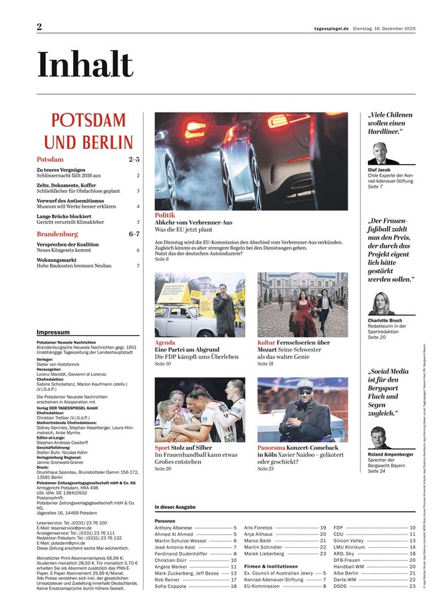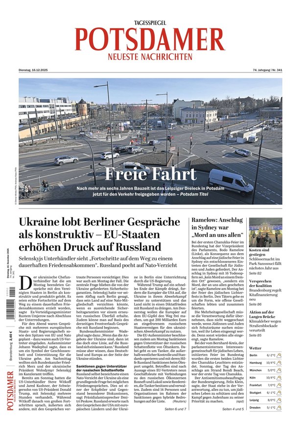 Wenn Sie täglich über die neuesten Geschehnisse informiert sein wollen, dann sind die Potsdamer Neueste Nachrichten PNN die richtige Wahl. Neben wichtigen regionalen Berichten über die Landeshauptstadt Potsdam und das Land Brandenburg wird in Kooperation mit dem Tagesspiegel auch über nationale und internationale Themen berichtet. Die Potsdamer Neueste Nachrichten greifen bei Ihren Recherchen auf ein weltweit einmaliges Expertenteam zurück. Eine fundierte Berichterstattung zu allen Bereichen (Politik, Verkehr, Bau, Gesundheit uvm.) ist der Anspruch, dem die Potsdamer Neueste Nachrichten seit 1951 gerecht werden.