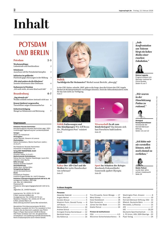 Wenn Sie täglich über die neuesten Geschehnisse informiert sein wollen, dann sind die Potsdamer Neueste Nachrichten PNN die richtige Wahl. Neben wichtigen regionalen Berichten über die Landeshauptstadt Potsdam und das Land Brandenburg wird in Kooperation mit dem Tagesspiegel auch über nationale und internationale Themen berichtet. Die Potsdamer Neueste Nachrichten greifen bei Ihren Recherchen auf ein weltweit einmaliges Expertenteam zurück. Eine fundierte Berichterstattung zu allen Bereichen (Politik, Verkehr, Bau, Gesundheit uvm.) ist der Anspruch, dem die Potsdamer Neueste Nachrichten seit 1951 gerecht werden.