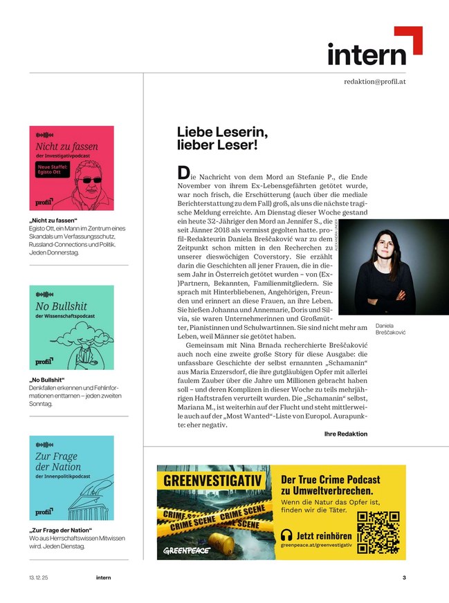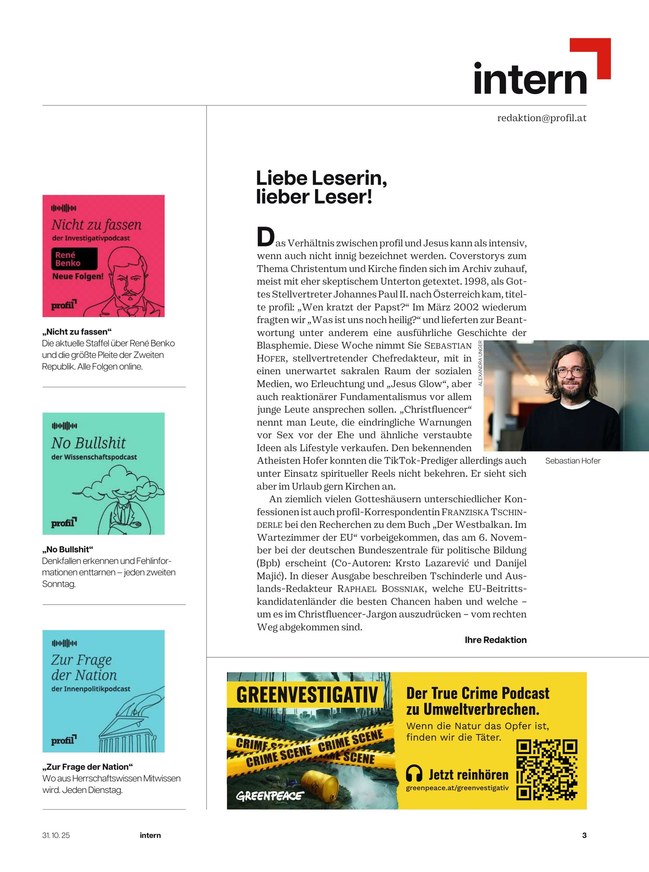 Österreichs unabhängiges Nachrichtenmagazin PROFIL steht für kritische Berichterstattung zu spannenden Themen. Lesen Sie ein ePaper, das investigativ, fundiert und meinungsbildend zugleich ist. Weiterlesen...