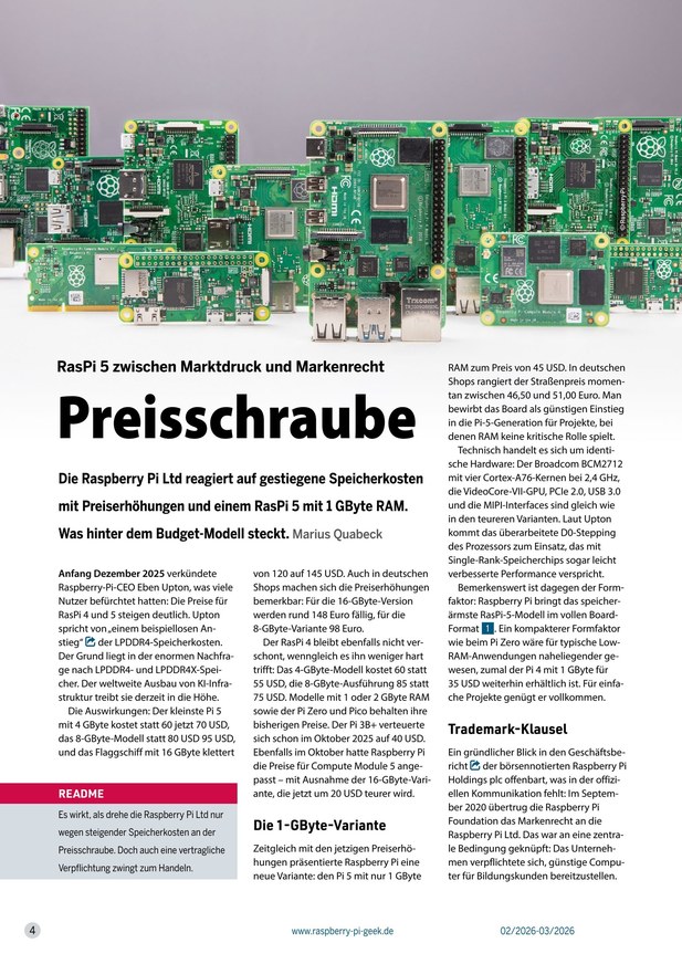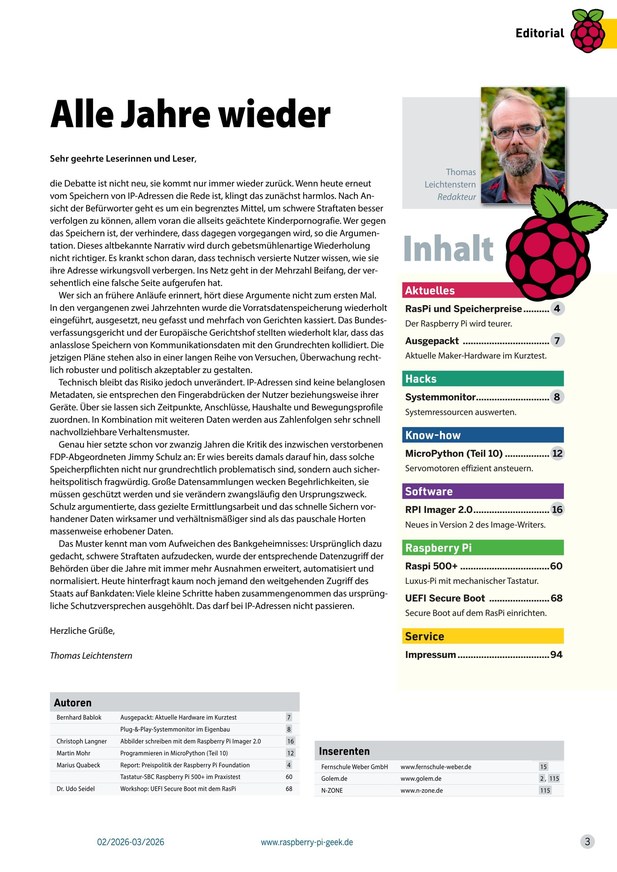 Sie setzen den Raspberry Pi für private oder berufliche Projekte ein und interessieren sich für weitere Nutzungsmöglichkeiten des Minicomputers? Im alle zwei Monate erscheinenden ePaper der Computerzeitschrift Raspberry Pi Geek finden Sie Inspiration, praktische Tipps und bekommen das für die Arbeit mit dem Raspberry Pi erforderliche Know-how vermittelt. Sie können das ePaper von Raspberry Pi Geek am Smartphone, Tablet oder Computer lesen. Das ePaper steht als PDF zum Download zur Verfügung.