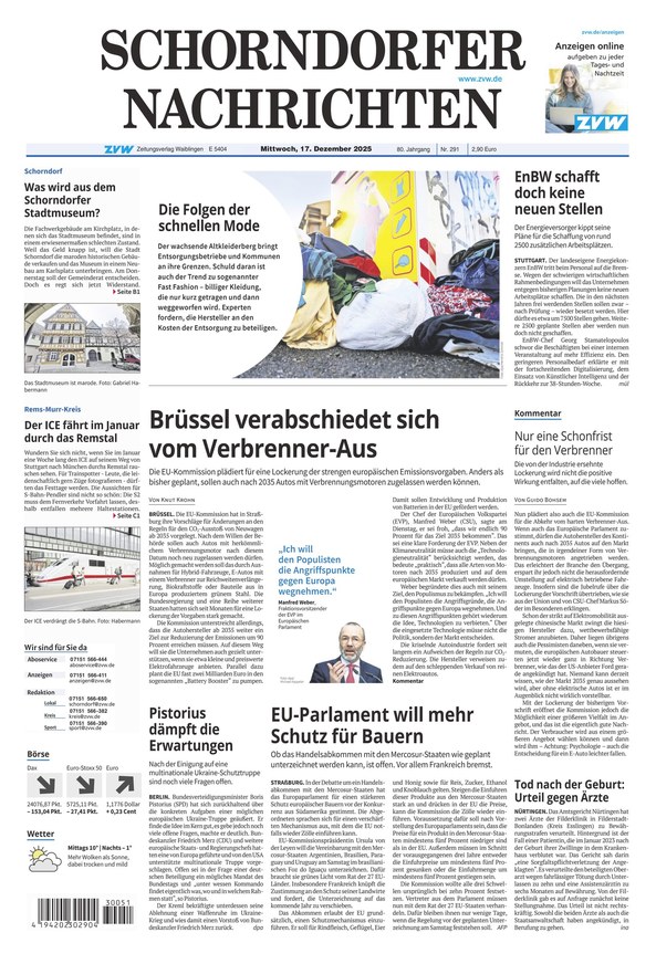 Von Montag bis Samstag erfahren Sie aus dem ePaper der Schorndorfer Nachrichten alle Nachrichten aus Schorndorf und Umgebung. Zusätzlich werden Sie über News und Themen aus Deutschland und der Welt informiert. Die digitale Ausgabe der Tageszeitung enthält alle Inhalte, die Sie aus der gedruckten Ausgabe kennen und schätzen. Sie erhalten die gewohnte Qualität und profitieren von zusätzlichen Vorteilen bzw. Funktionen wie Suche, Zoom und PDF-Download.
