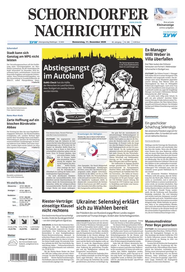 Von Montag bis Samstag erfahren Sie aus dem ePaper der Schorndorfer Nachrichten alle Nachrichten aus Schorndorf und Umgebung. Zusätzlich werden Sie über News und Themen aus Deutschland und der Welt informiert. Die digitale Ausgabe der Tageszeitung enthält alle Inhalte, die Sie aus der gedruckten Ausgabe kennen und schätzen. Sie erhalten die gewohnte Qualität und profitieren von zusätzlichen Vorteilen bzw. Funktionen wie Suche, Zoom und PDF-Download.