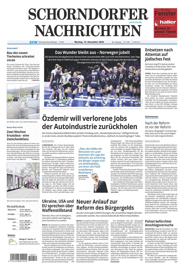 Nachrichten aus der und für die drittgrößte Stadt des Rems-Murr-Kreises: Erfahren Sie täglich Neuigkeiten aus Buhlbronn, Haubersbronn, Mannshaupten, Metzlinsweiler Hof, Metzlinsweiler Mühle, Miedelsbach, Oberberken, Schlichten, Schornbach, Unterberken und Weiler/Rems. Die Tageszeitung für die Region Schorndorf und Umgebung setzt auf eine angenehme Mischung aus Information, Unterhaltung und Service. In Leitartikeln und Kommentaren bezieht die Redaktion Stellung und vertritt klare Standpunkte.