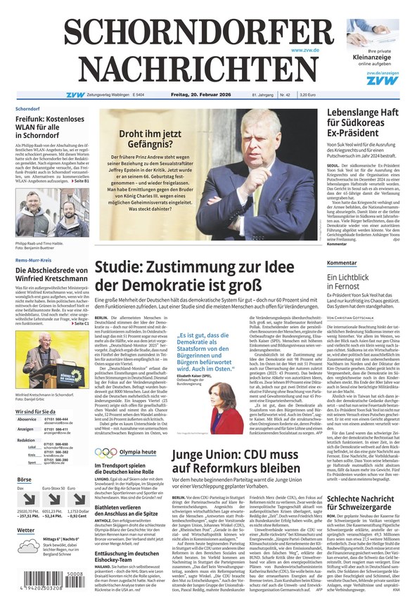 Die Schorndorfer Nachrichten berichten täglich über alles, was in Schorndorf und Umgebung wichtig ist. Das ePaper Ihrer regionalen Tageszeitung informiert Sie über alle News und Themen. Weiterlesen...