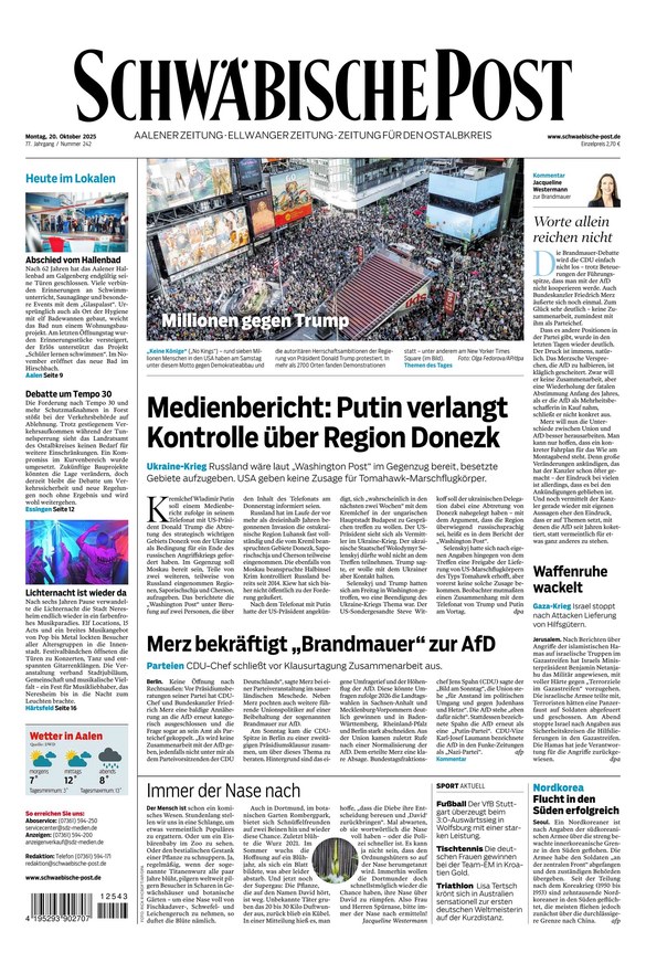 Die Schwäbische Post ist die Tageszeitung für Aalen, Ellwangen, Schwäbisch Gmünd und Umgebung. Das ePaper bietet aktuelle News aus der Region, Deutschland und der Welt. Weiterlesen...