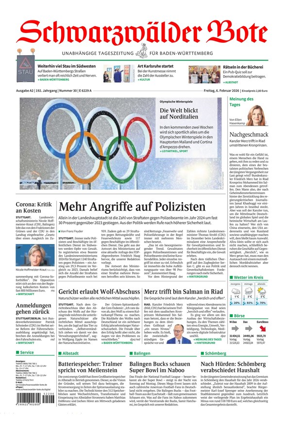 Der Schwarzwälder Bote ist eine regionale Tageszeitung im Raum Schwarzwald und oberer Neckar. Er steht für starke Nachrichten aus der Region, auf den Punkt recherchierte Exklusivgeschichten und prägnante Kommentare.