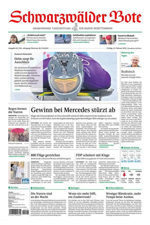 Der Schwarzwälder Bote ist eine regionale Tageszeitung im Raum Schwarzwald und oberer Neckar. Er steht für starke Nachrichten aus der Region, auf den Punkt recherchierte Exklusivgeschichten und prägnante Kommentare.