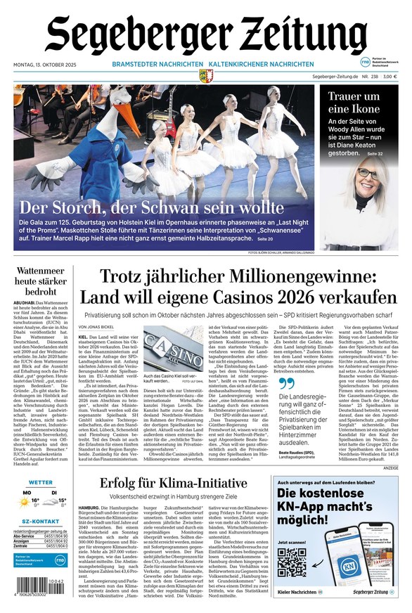 Die Segeberger Zeitung berichtet als Lokalzeitung vorwiegend über alle aktuellen Geschehnisse aus dem Kreis Segeberg in Schleswig-Holstein, informiert aber auch über überregionale Nachrichten. Weiterlesen...